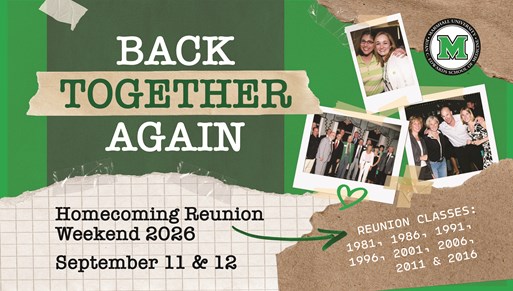 To help plan your reunion or prepare for your next visit to Huntington, contact Linda Holmes, associate dean for development & alumni affairs, at 304.691.1711 or holmes@marshall.edu.